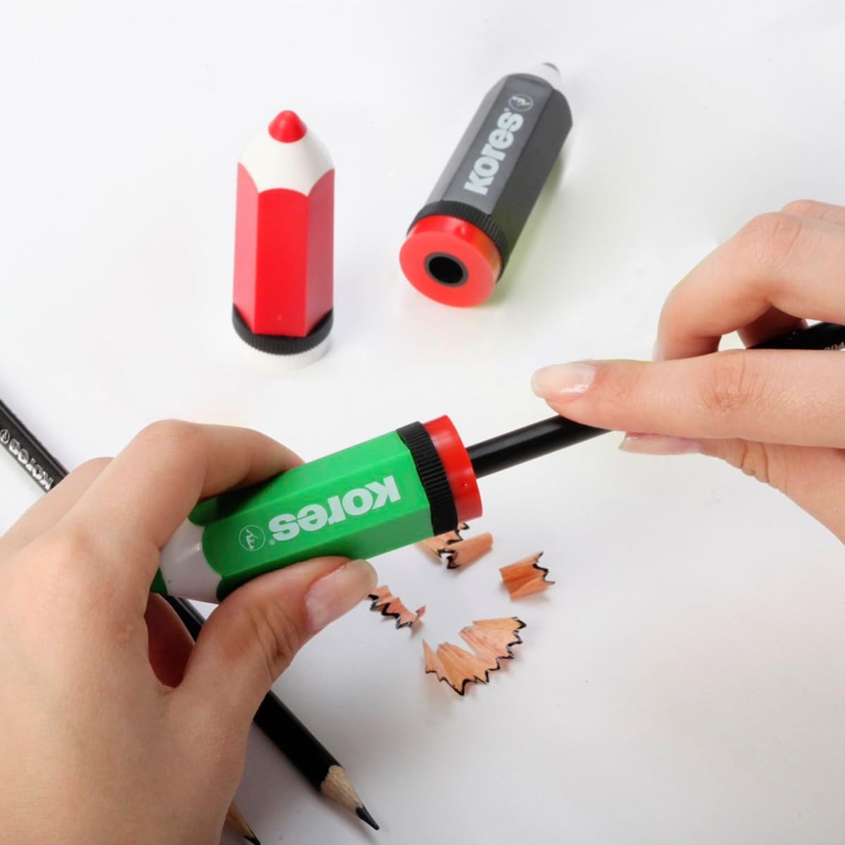 El sacapuntas sencillo con depósito Kolorito Kores 35811 es un sacapuntas manual de plástico en divertida forma de lápiz, con depósito integrado para recolectar la viruta y mantener limpio el escritorio. Cuenta con una navaja de acero de alta calidad fabricada en Alemania, que afila con facilidad lápices de grafito y de color estándar, ideal para uso escolar diario. Está disponible en 5 colores surtidos brillantes (cuerpo translúcido), y se comercializa por pieza o en cajas de 20, pensado para papelerías y listas de útiles de primaria y preescolar.