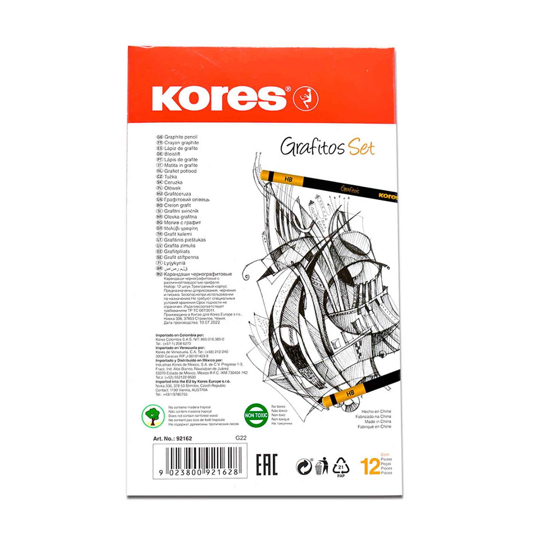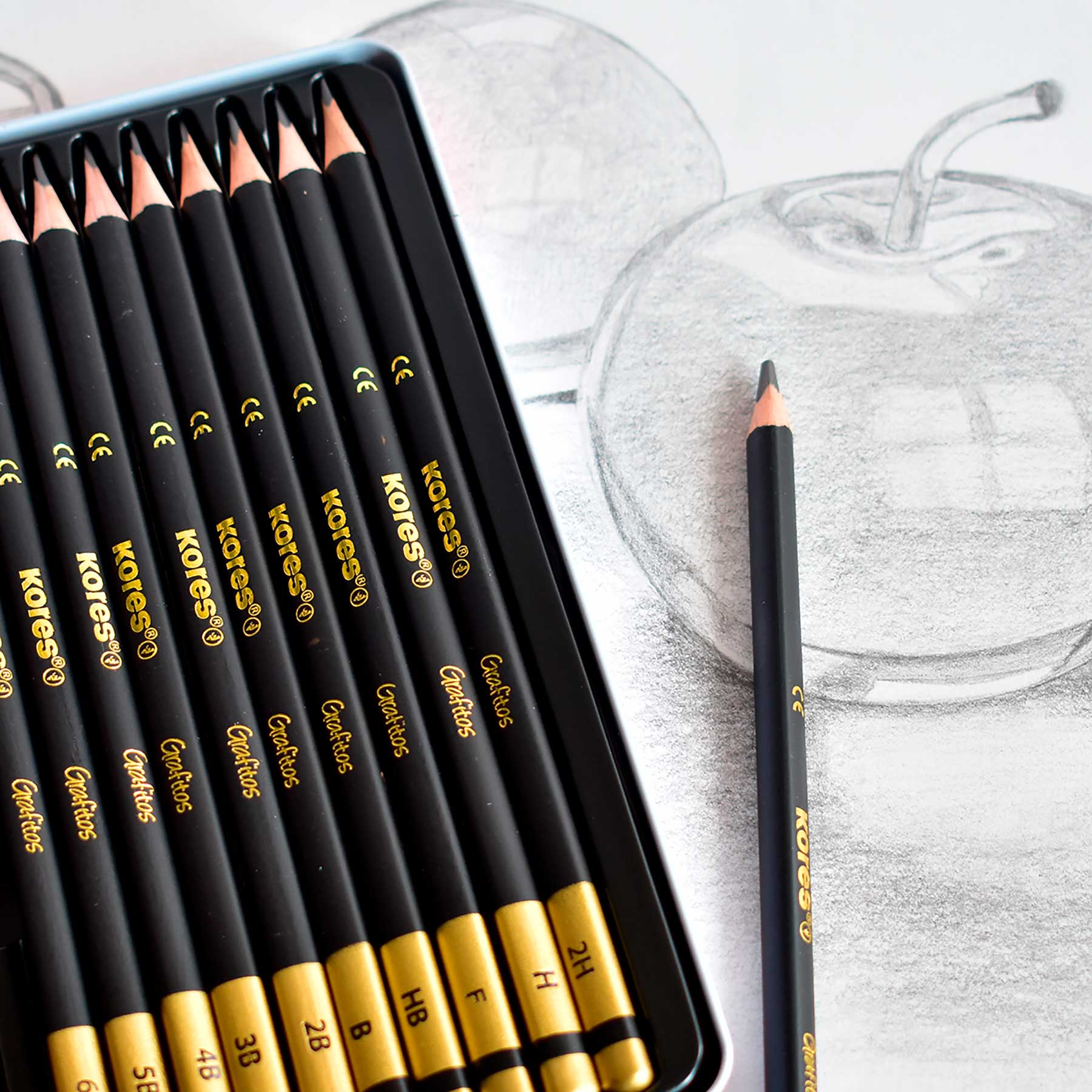El set de lápices de grafito graduados Kores 92162 incluye 12 lápices de diferentes grados (8B, 7B, 6B, 5B, 4B, 3B, 2B, B, HB, F, H y 2H), cubriendo desde minas muy suaves y oscuras hasta minas duras para trazos finos y precisos, ideal para dibujo técnico, artístico y bocetaje. Cada lápiz tiene cuerpo de madera de alta calidad con forma triangular ergonómica para mejor agarre y afilado uniforme, puntas súper resistentes y mina de alto rendimiento, empacados en estuche metálico que protege y organiza el juego para transporte y uso profesional.