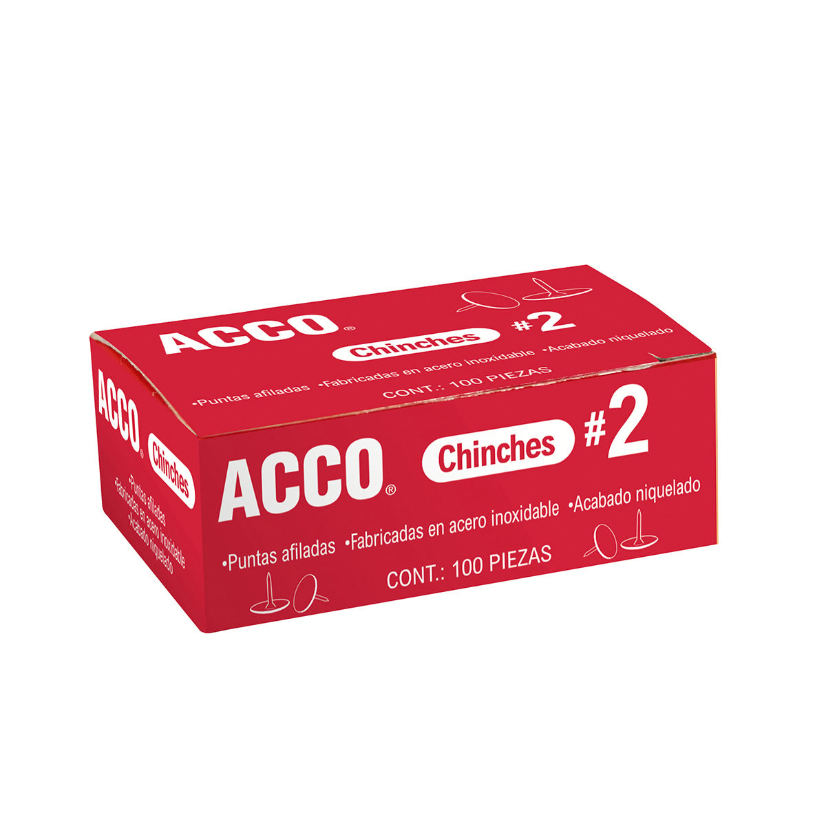 Las chinches metálicas ACCO P2629 son tachuelas tamaño #2 con longitud aproximada de 3/8” (9.53 mm), fabricadas en acero con acabado niquelado que ayuda a evitar la oxidación y mejora la durabilidad. Vienen en caja con 100 piezas, en color metálico/acero inoxidable, con punta tipo cincel o afilada que facilita la penetración en tableros de corcho, paneles y otras superficies adecuadas.