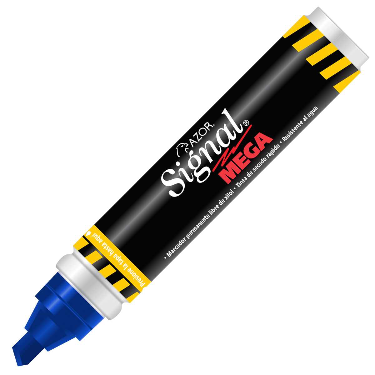 Signal Mega de Azor es un marcador permanente con tinta base solvente de alto desempeño, diseñado para uso rudo e industrial en almacenes y bodegas. Cuenta con barril de aluminio resistente y punta de cincel que permite trazos gruesos o delgados. Es rellenable con tinta Dry Line y su tinta seca rápido, siendo resistente al agua y capaz de marcar sobre superficies húmedas o grasosas como vidrio, porcelana, metal, tela, madera, plástico y cartón. Se recomienda usar en áreas ventiladas y mantener tapado para conservar la tinta.