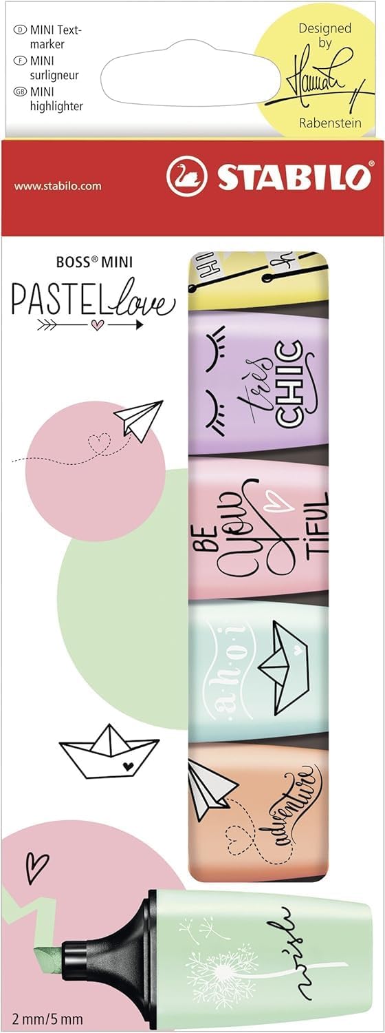 El set Marcatextos Boss Mini Pastel C/6 | Stabilo 07/06-27 incluye 6 resaltadores en colores pastel vibrantes y suaves, con diseño compacto ideal para llevar en bolsillo o estuche pequeño. Cada marcador cuenta con punta biselada que permite trazos de 2 y 5 mm, perfecto para subrayar y destacar tanto texto como títulos. La tinta es a base de agua, no tóxica y ofrece hasta 4 horas de protección contra el secado, lo que brinda mayor durabilidad y comodidad en el uso creativo o escolar.